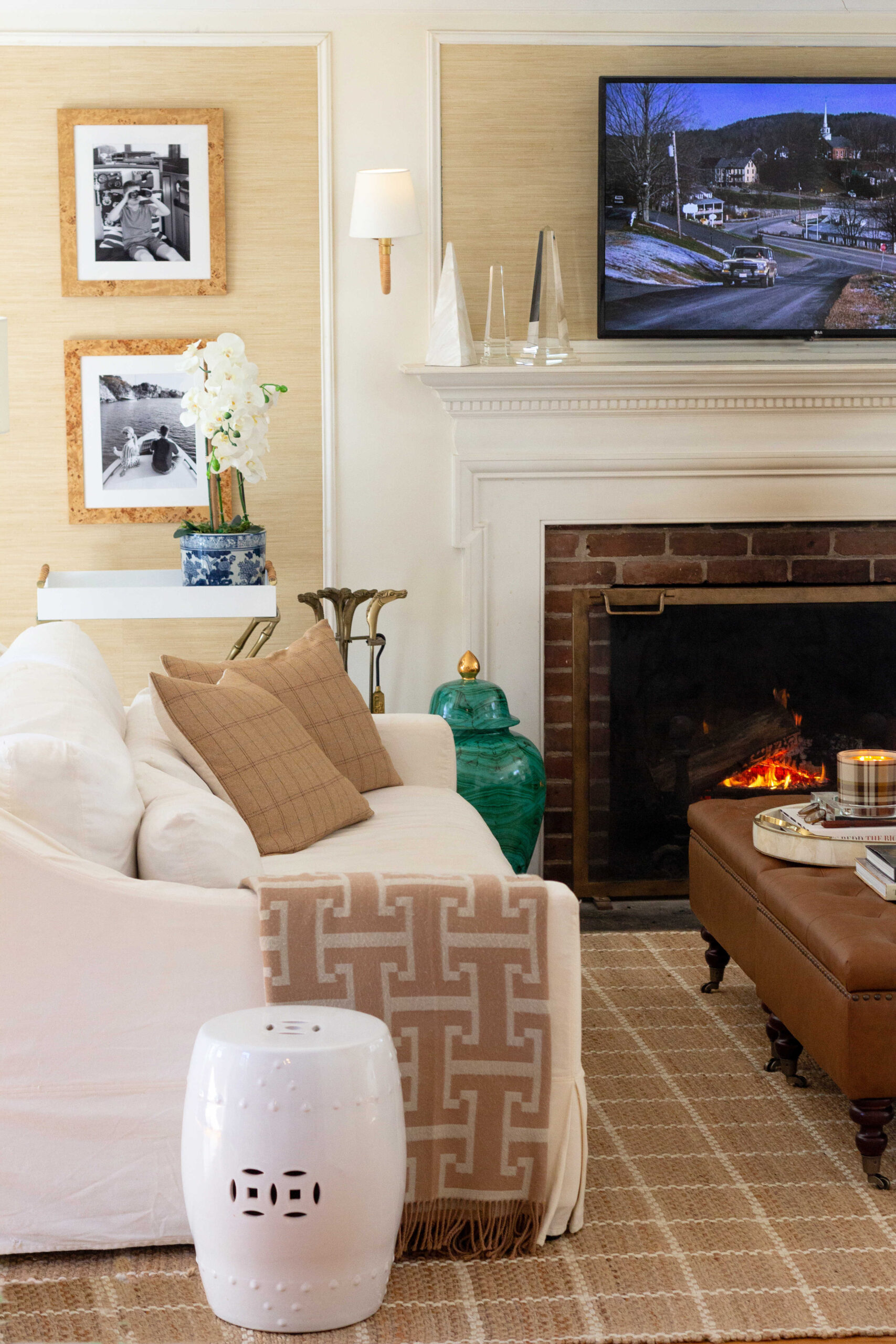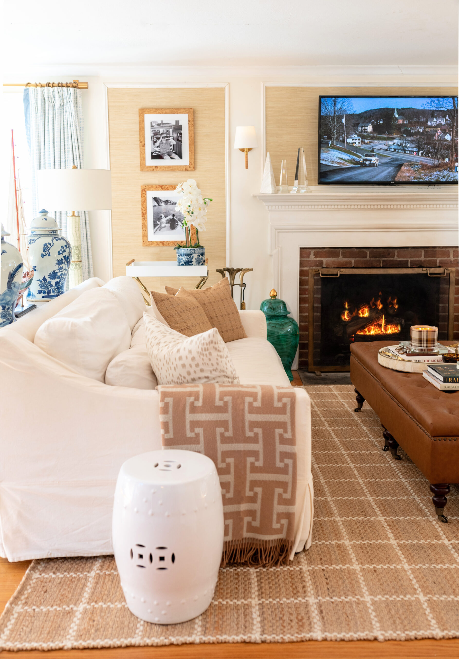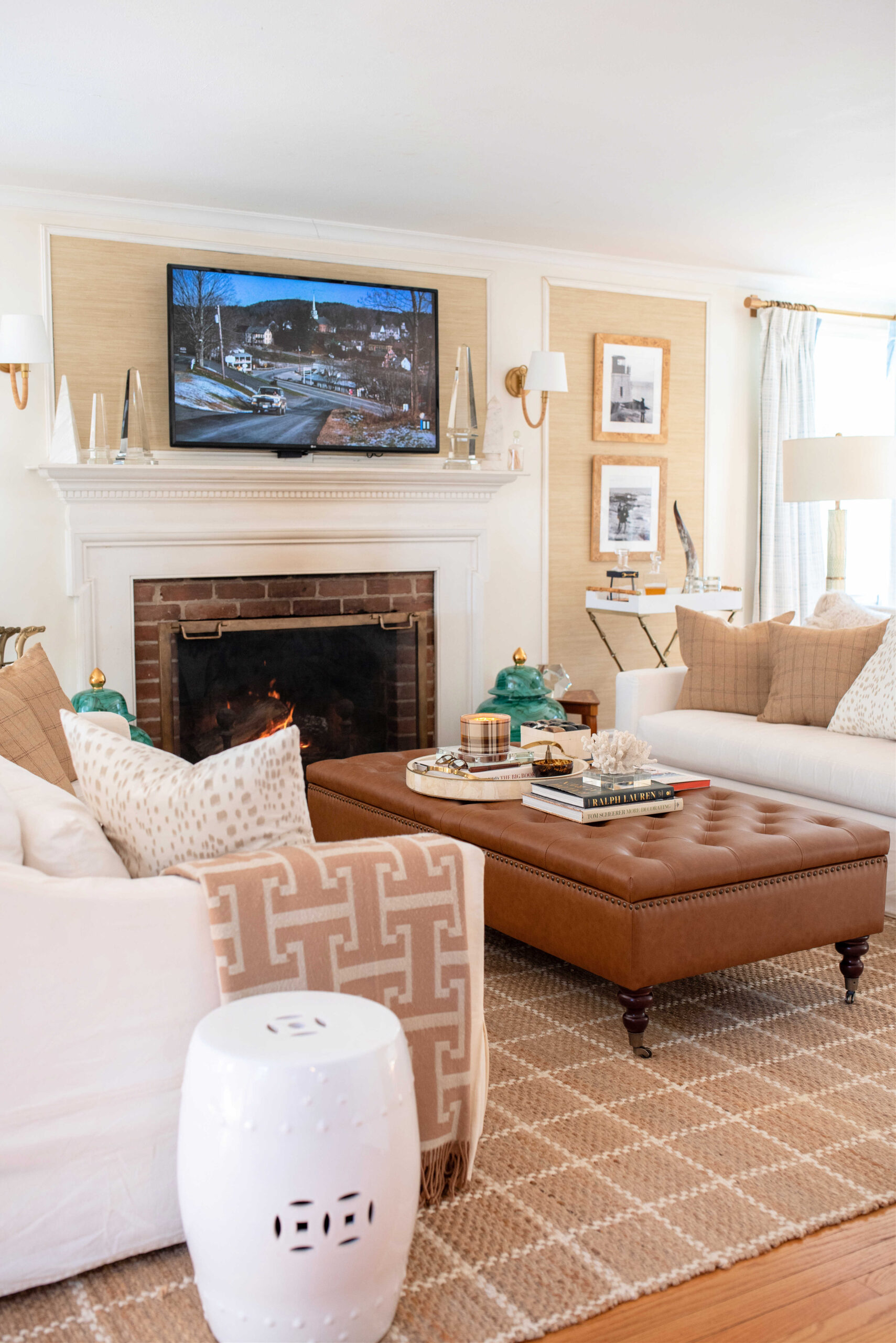 The main changes I made to our living room for winter are the new windowpane rug, the tufted ottomans, the tweed and neutral pillows, and the coffee table books I display on our ottoman.